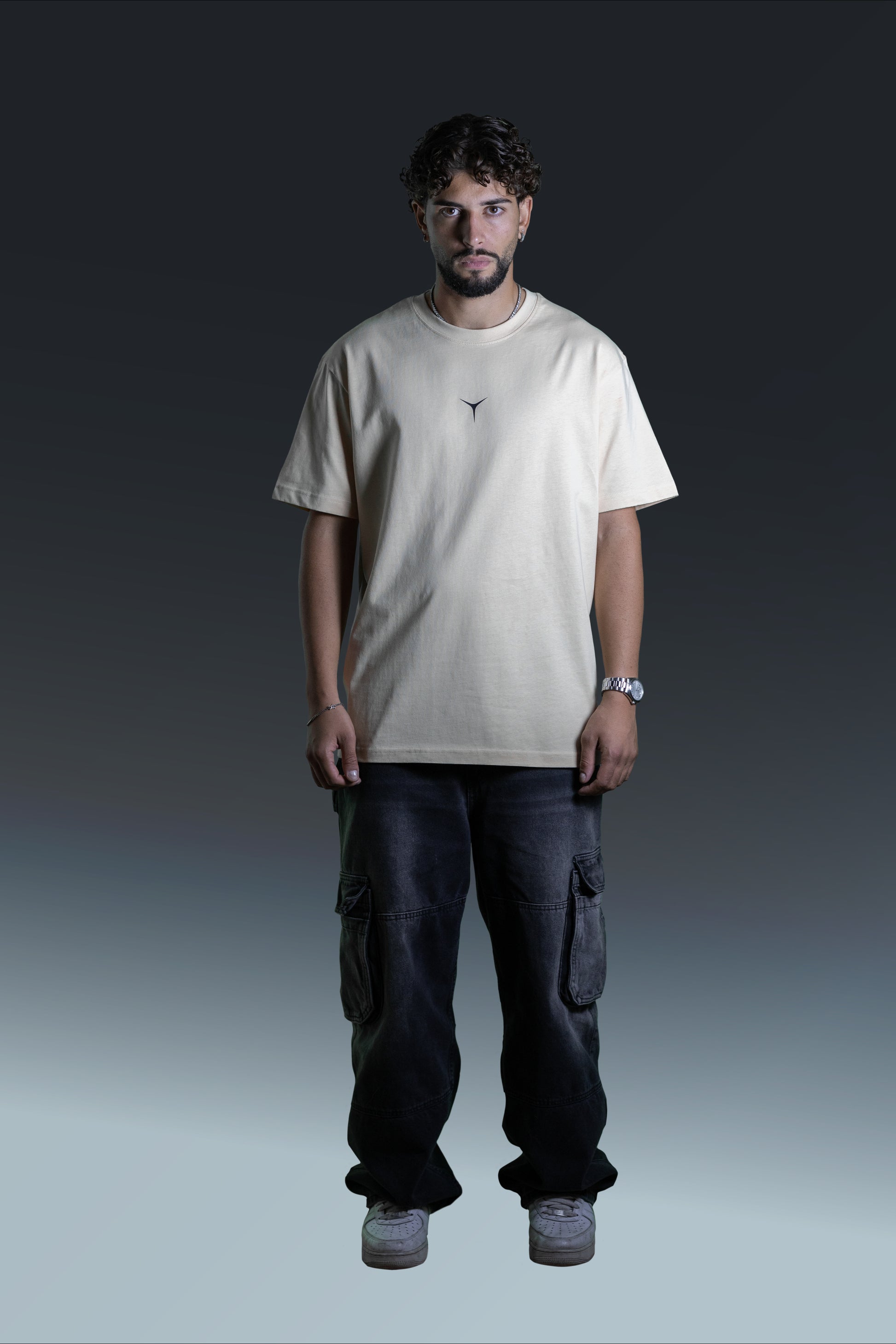T-shirt oversize a maniche corte. Scollo rotondo con bordo a costine 2x1 e cuciture overlock abbinate. Cuciture laterali. Ampia impuntura a doppio ago su manica e orlo.